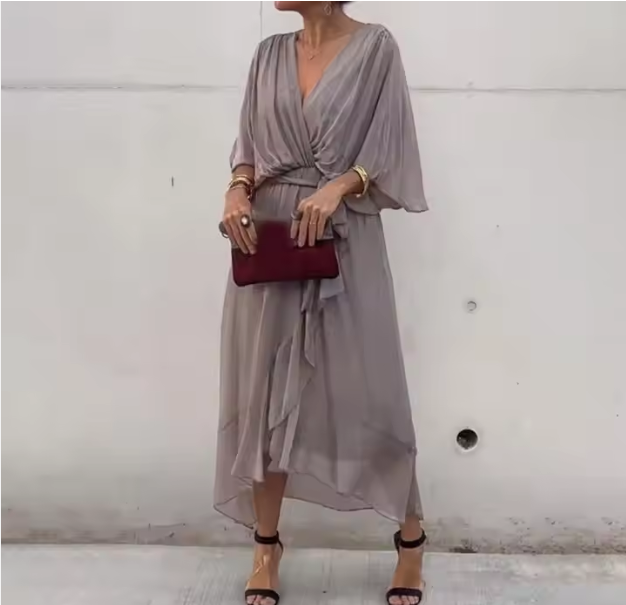 Questo abito in chiffon è un sogno di leggerezza: il tessuto impalpabile danza ad ogni movimento, accarezzando la pelle con grazia. Il taglio fluido e svolazzante valorizza la silhouette senza costringerla, regalando un'eleganza naturale e disinvolta. Perfetto per le giornate luminose, abbinato a un sandalo
